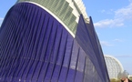 Volviendo a Valencia y su “Ciudad de los museos”, el conjunto está formado por cuatro edificios, un puente y la ordenación de los jardines (espacios ganados al Turia), todos ellos diseñados por Santiago Calatrava y otros colegas. El edificio que más llamó mi atención es el llamado “Ágora” que, por su nombre, identifiqué como un lugar de encuentro. Con forma de pez globo color añil; la espina dorsal son los lucernarios que iluminan el espacio interior y el resto de sus paredes están revestidas (aquí intuyo la influencia gaudiniana) de pequeños fragmentos de azulejo. Formalmente, muy logrado. Mi sorpresa fue cuando, al acercarme para hacer las fotos, observé que el edificio está en desuso y en pleno deterioro. Todos sabemos que cuando una casa no se habita, se arruina. ¿Un Ágora vacío, al que nadie acude y no se utiliza? Pues eso parece, y no creo que solo por la “crisis”, sino porque tal vez el conjunto fue hiper-dimensionado desde el principio en uno de esos ejercicios de despilfarro y pretenciosidad a los que se nos acostumbró en los “felices noventa”. Una pena.