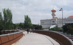 FOTO 1: Vista de un extremo del puente: el Centro Cultural Islámico, donde se aloja la mezquita, edificio que fue objeto de un concurso internacional hacia el año 1980 y cuyo premió ganó un equipo ¿polaco?. Posteriormente, fue objeto de reformas "islamizando" el exterior, desde mi punto de vista algo meramente ornamental ya que la concepción inicial del conjunto (que no es solo mezquita aunque aloje una mezquita) sí contiene muchos elementos de arquitectura árabe.